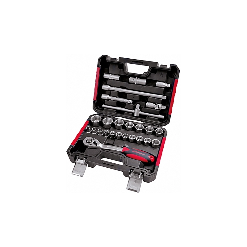 Serie chiavi a bussola 26 pz, con cricchetto attacco da 1/2" con 72 denti, 2 prolunghe da 125 e 250 mm, 1 snodo, 1 quadro maschio, 1 manubrio da 250 mm con slitta, 2 bussole prolungate da 16 e 21 mm. Misure bussole da 10 mm a 32 mm. In valigetta.