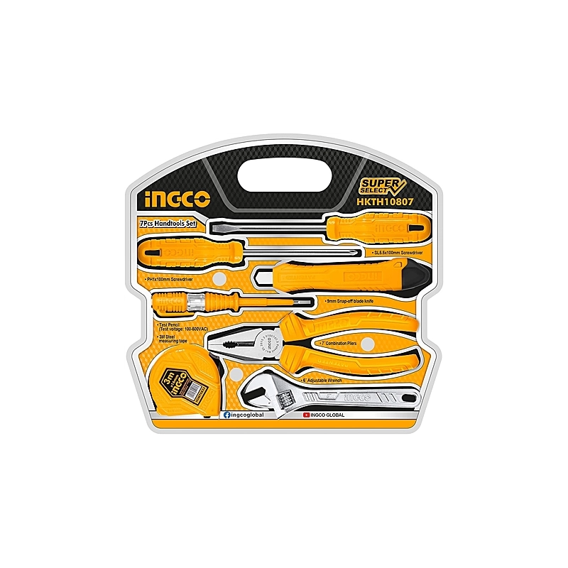 Set di 7 utensili che include: 1 pinza universale, 1 cacciavite cercafase, 1 chiave a rullino, 1 cutter, 1 cacciavite SL5,5x100 mm, 1 cacciavite PH1x100 mm e 1 flessometro.