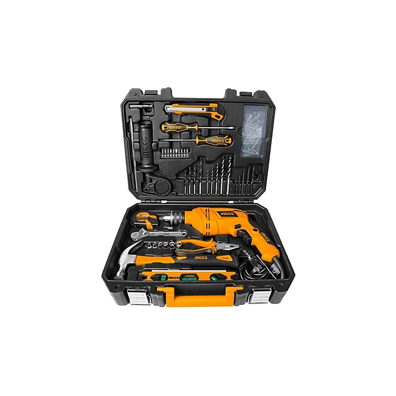 Valigetta contenente 101 utensili assortiti tra: punte, bussole, cacciaviti, tasselli, viti, 1 trapano, 1 pinza, 1 flessometro, 1 cutter, 1 martello, 1 mini livella, ecc.