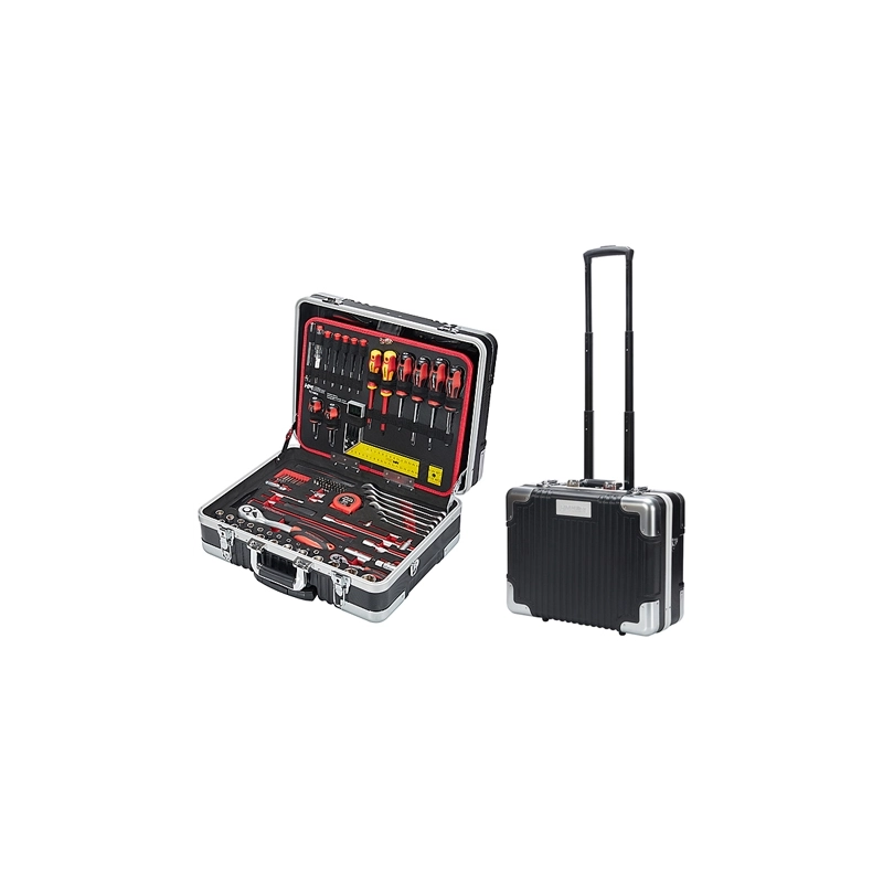 Cassetta trolley in alluminio con manico estensibile. Contenuto 147 utensili assortiti per manutentori tra cui: bussole, cricchetti, cacciaviti, flessometro, chiavi combinate, prolunghe, ecc..