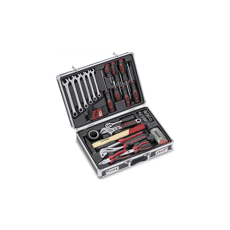 9 bussole attacco 1/4" mm da 5-13, 11 chiavi esagonali mm da 1,27-6, 6 chiavi combinate mm 10-15, 10 inserti TAGLIO mm 3/4/5/6, CROCE PH1/PH2/PH3, TORX T15/T20/T30, 1 porta inserti magnetico, 2 cacciaviti a taglio mm 5/6, 2 a croce PH1/PH2, 1 cacciavite a taglio nano 6x38, 1 cacciavite a croce nano PH2x38 - 1 impugnatura gommata, 1 cricchetto attacco 1/4", 1 martello e 1 rotolo di nastro adesivo