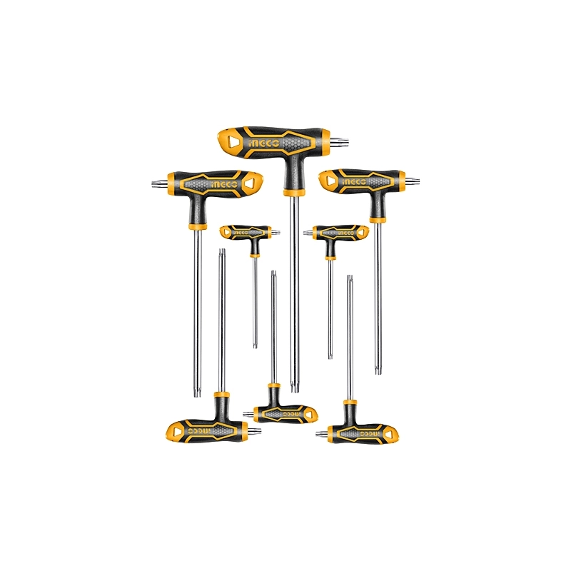 Serie di 8 chiavi torx a T al cromo vanadio con trattamento termico. Misure: T10x75 mm, T15x75 mm, T20x100 mm, T25x100 mm, T30x150 mm, T40x150 mm, T45x200, T50x200 mm.