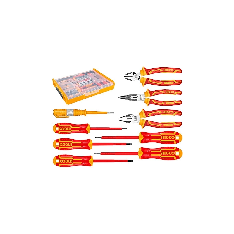 Set composto da: 1 tronchese, 1 pinza becchi lunghi, 1 pinza universale, 5 cacciaviti e 1 cacciavite cercafase. In valigetta.