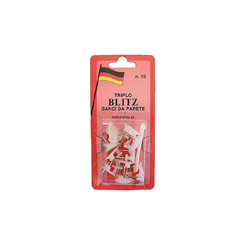 Gancio BLITZ triplo originali in nylon con chiodi in acciaio speciale super appuntiti, Made in Germany. Da parete con 3 chiodi, portata 25 kg. Blister da 10 pezzi con aplicatore.