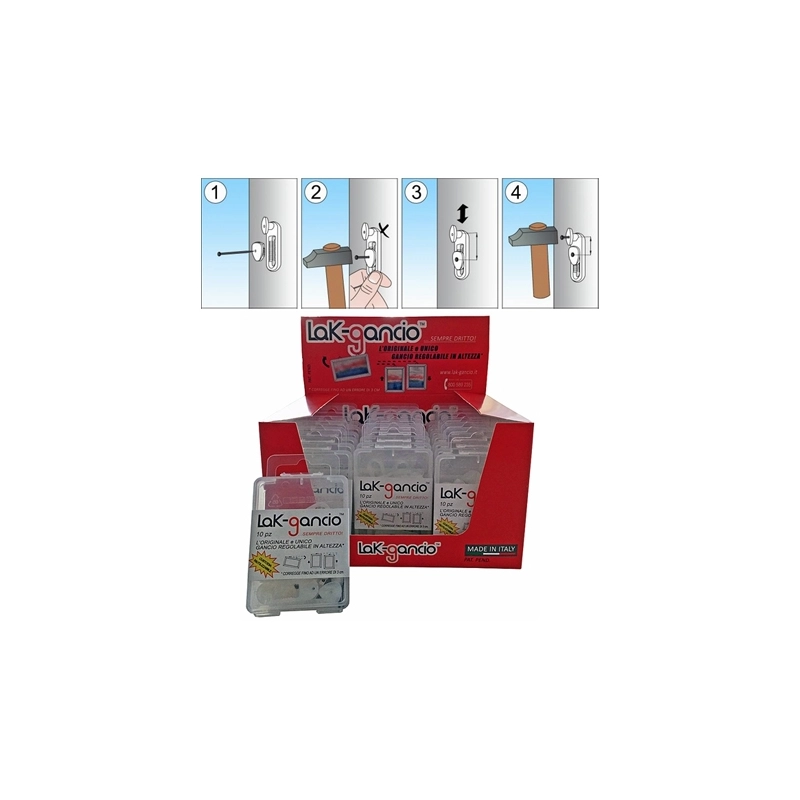 Gancio brevettato con chiodo regolabile in altezza con correzione di errore fino a 3 cm. Blister con 10 pezzi. Made in Italy.