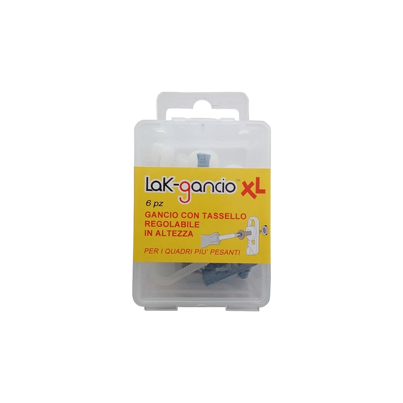 Gancio brevettato con vite e tassello regolabile in altezza con correzione di errore. Blister con 6 pezzi. Made in Italy.