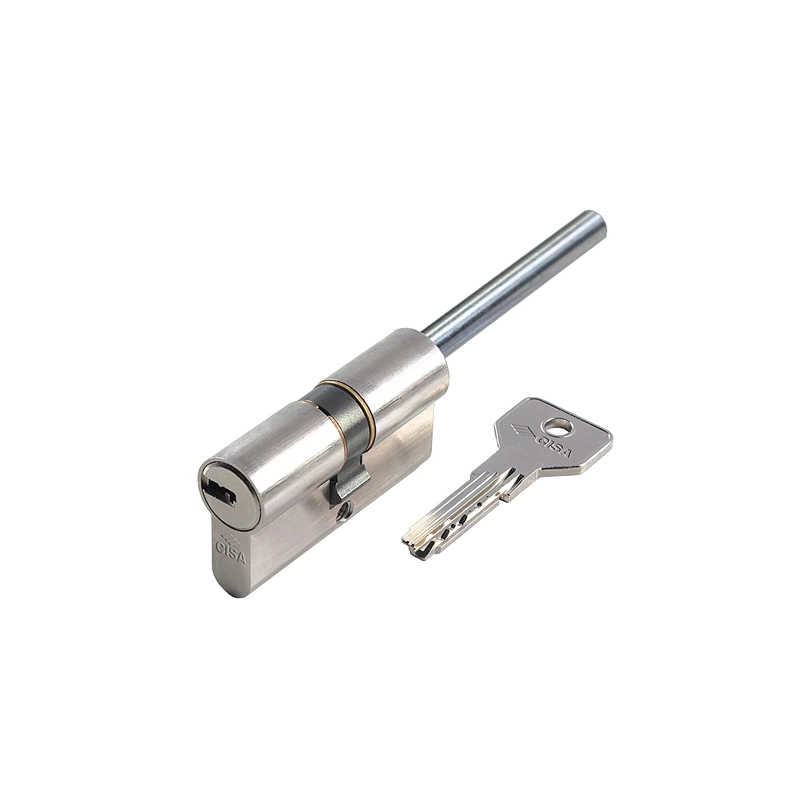 Cilindro Asix in ottone nichelato, predisposto per montaggio pomolo con gambo accorciabile e chiavi punzonate a 6 perni. Resistenza al trapano con primo perno e controperno in acciaio cementato. In dotazione 1 vite di fissaggio e 3 chiavi. Camma DIN. Modello = lunghezza totale mm/posizione centro nottolino mm