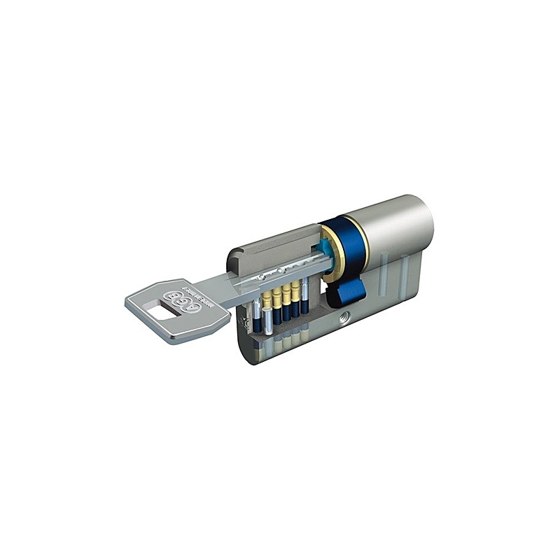 Cilindro di sicurezza in ottone nichelato opaco, 3 spine di protezione antitrapano con 7 pistoncini cifratura e 5 chiavi in dotazione. Non frizionati (chiave-chiave). Camma DIN. Modello = lunghezza mm./posizione centro nottolino mm