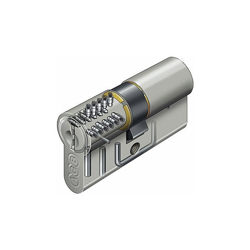 Cilindro di sicurezza in ottone nichelato opaco, protezione antitrapano con 17 pistoncini e 5 chiavi in dotazione. Camma DIN. Modello = lunghezza mm./posizione centro nottolino mm