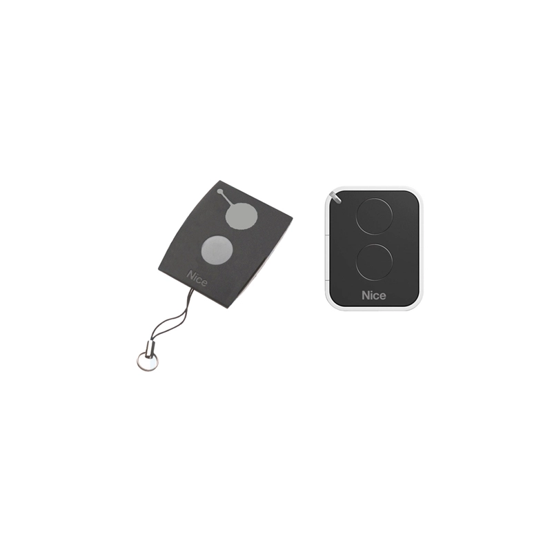 Telecomando a una frequenza Mhz 433,93 a 2 pulsanti. Colore grigio, con laccetto per portachiavi.