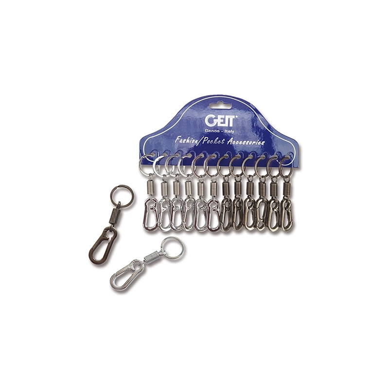 In metallo, con moschettone e molla. In cartella da 12 pezzi. Lunghezza totale 10,5 cm. Due finiture assortite.
