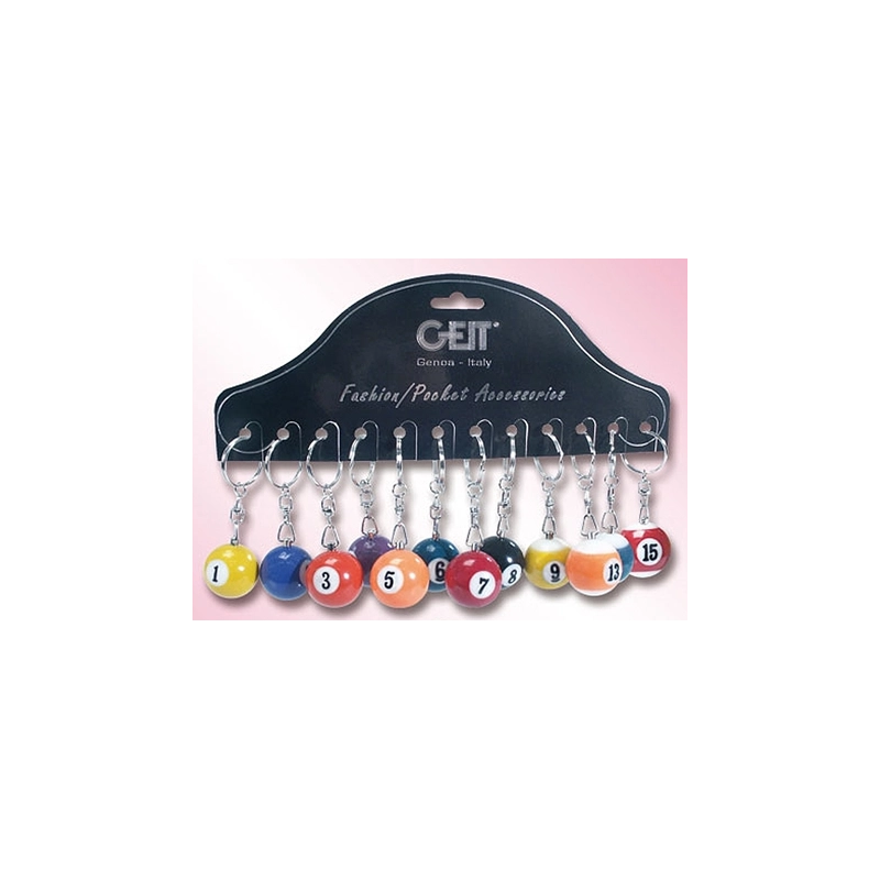 Portachiavi a forma di palle da biliardo di diametro 3 cm. Colori assortiti. In cartella da 12 pezzi.