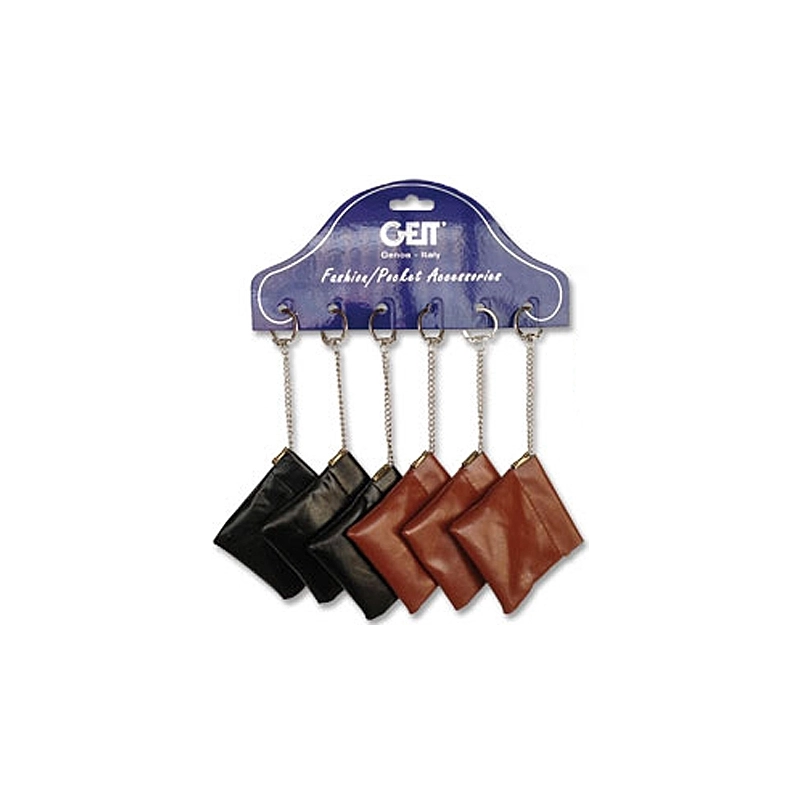 Portachiavi in pelle con chiusura a molla e catenella. Dimensioni 8,5x9x0,5 cm. In cartella da 6 pezzi.