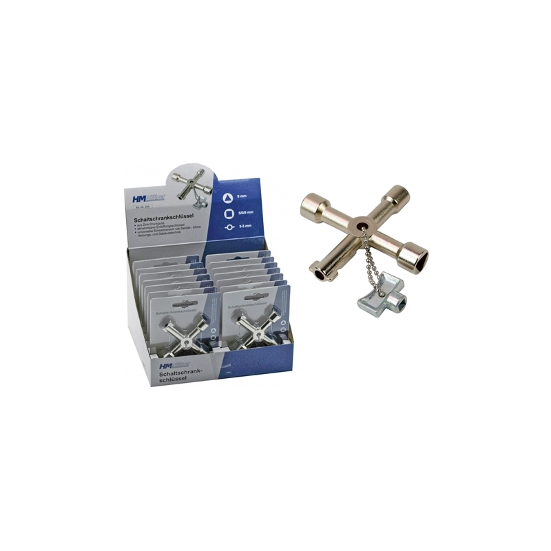 Chiave a croce universale multifunzione. Dimensioni quadri mm 5, 6, 9, triangolo mm 9, doppia mappa con foro.