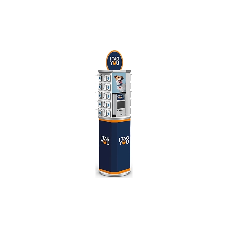 Espositore da terra girevole con 55 posizioni e alloggio macchina. Materiale MDF. Dimensioni diametro 50 cm, altezza 187 cm.