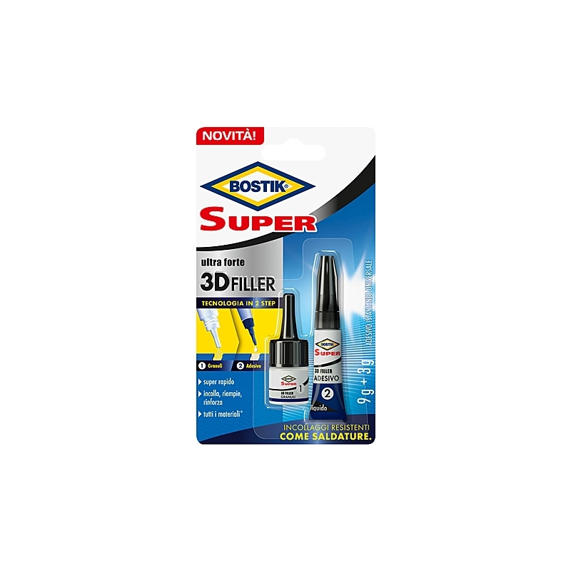 Collante riempitivo formato da 2 tubetti: 1 contenente granuli riempitivi 3D e l'altro con cianoacrilato liquido. Funziona in 2 step: applicare uno strato di granuli sul punto di rottura, versare il cianoacrilato liquido sui granuli. Adatto per molte materie plastiche, porcellana, ceramica, vetro, metallo, legno e gomma.