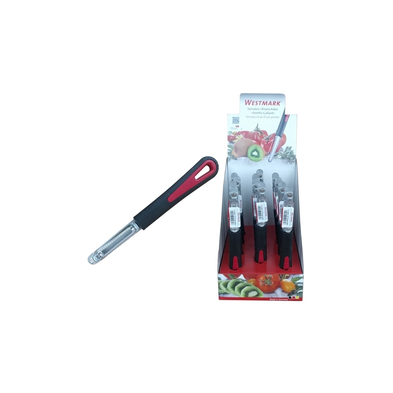 Espositore 12 pz. Pelapomodoro o kiwi in alluminio con rivestimento speciale per alimenti, manico in polipropilene con coprilama. Per destri e per mancini.