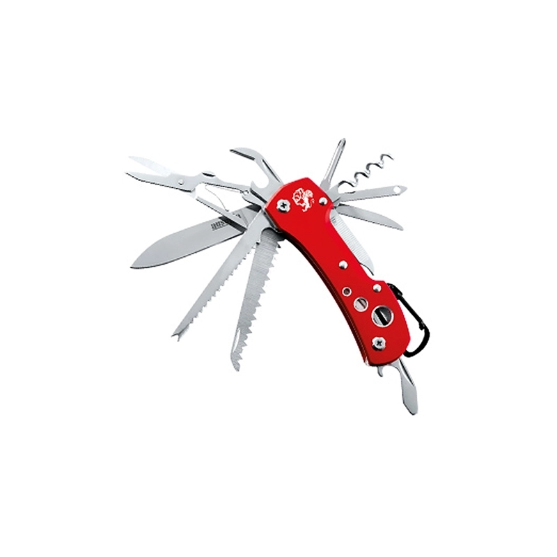 Coltello multiuso con 15 funzioni in acciaio inossidabile. Lunghezza da chiuso 95 mm. Peso 121 g.
