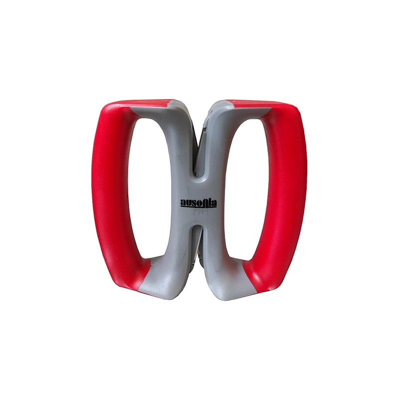 Affilacoltelli con ampia base di appoggio e manico bicomponente. 2 funzioni: sgrezzatura della lama e rifinitura del filo. Colori assortiti.