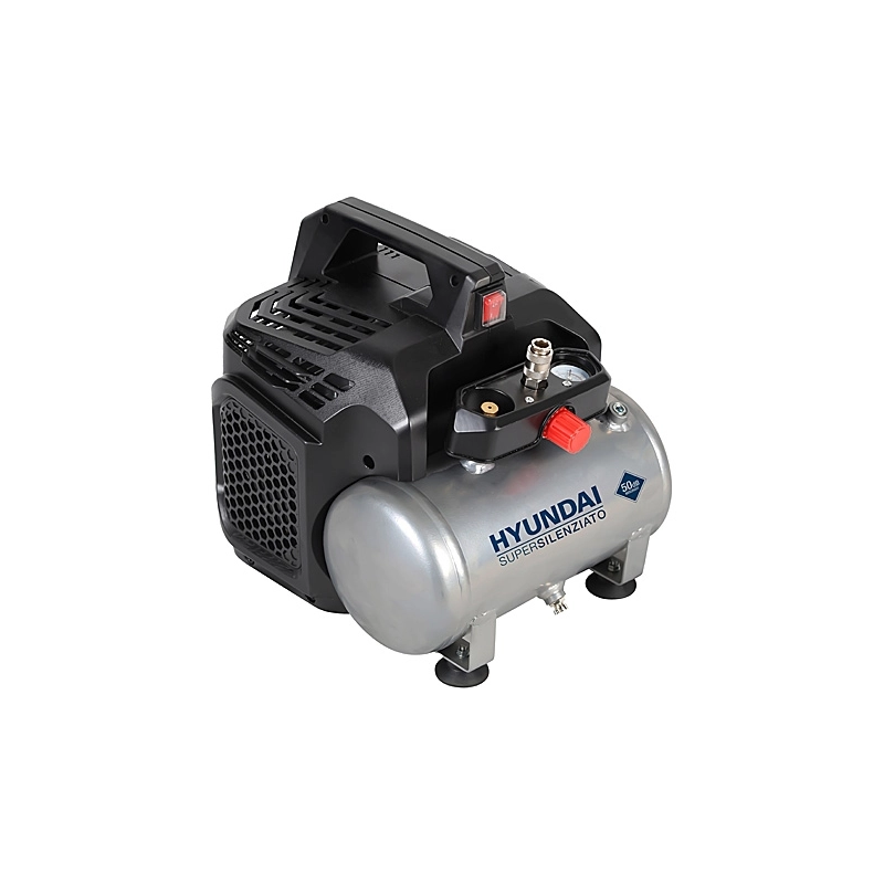 Compressore OIL-FREE super silenziato 50 dB. 230-240V. 1,0 HP. Aria aspirata 160 lt/min. Pressione max 8 bar. 1440 rpm giri/min. Con maniglia per facilitare il trasporto. Dimensioni 40x18x45 cm. Capacita' serbatoio 6 lt. Peso 14,5 kg.