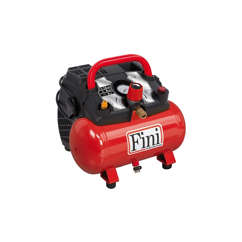 Serbatoio da lt 6. V 230. Potenza kW 1,1. Senza olio. Aria aspirata l/min 180. Pressione max bar 8. Numero cilindri 1. Peso kg 11