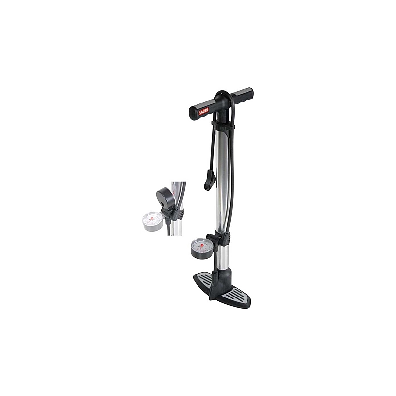 Pompa in alluminio con manometro 11 bar e serie adattatori per gonfiaggio biciclette, palloni, materassini e canotti. Impugnatura antiscivolo.