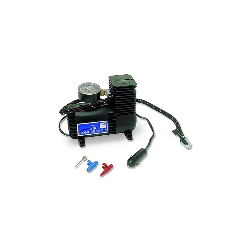 Minicompressore a 12V. Capacita' di gonfiaggio a 170 Psi. Adatto per il gonfiaggio di ruote, palloni e materassini. Completo di cavo con attacco per accendisigari.