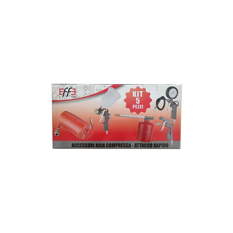 Kit 5 accessori per aria compressa. Contenuto: 1 pistola per soffiaggio, 1 pistola gonfiagomme, 1 pistola lavaggio, 1 aerografo e 1 tubo a spirale da 5 mt.