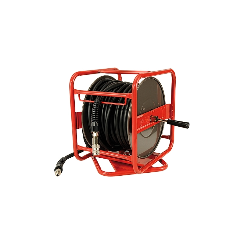 Avvolgitubo manuale per tubo aria in metallo verniciato con base girevole. Diametro tubo interno-esterno 10x15 mm. Lunghezza 30 mt. Tubo di collegamento all'impianto lunghezza 3 mt. Pressione max di lavoro 20 bar. Attacco maschio da 3/8''. Peso 8,5 kg.