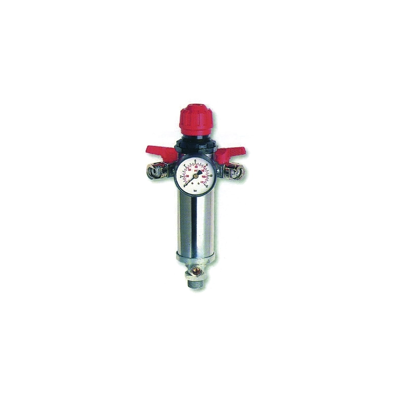 Dotato di filtro e manometro. Filettatura inferiore 1/2". Manometro diametro mm 50 con scala 0-12 bar. Materiale: alluminio nichelato.