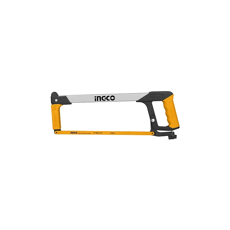 Seghetto professionale con doppia impugnatura bicomponente per taglio metallo. Tendilama regolabile. Lunghezza 300 mm.