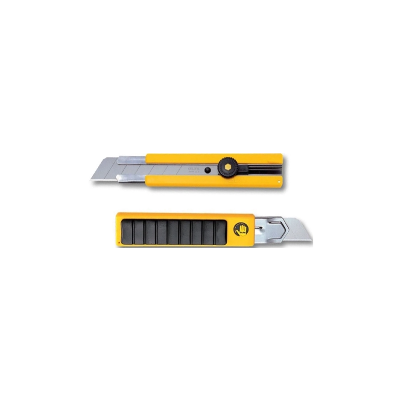 Cutter con corpo in metallo stampato rivestito in resina termoplastica pesante. Impugnatura con inserto in gomma per maggiore presa. Protezione lama per tagli sottosforzo. Ideale per tagliare cuoio, gomma, compensato, cartongesso, pannelli di copertura e materiali isolanti. Lama da 25 mm.