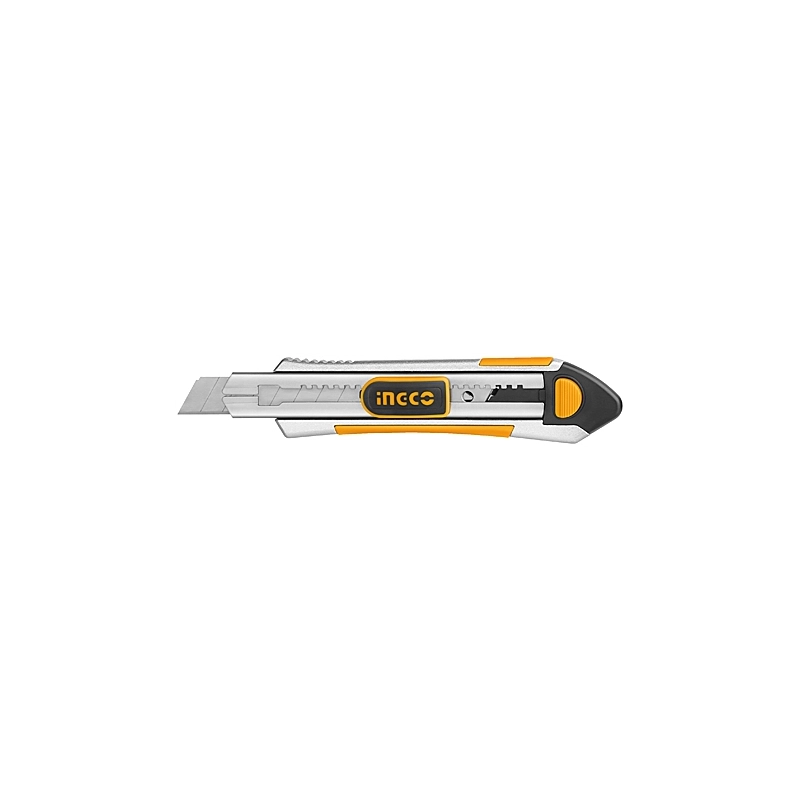 Cutter con corpo in alluminio. Con sistema di bloccaggio della lama. Pulsante piatto. Lama 18x100 mm. Con 6 lame SK5.