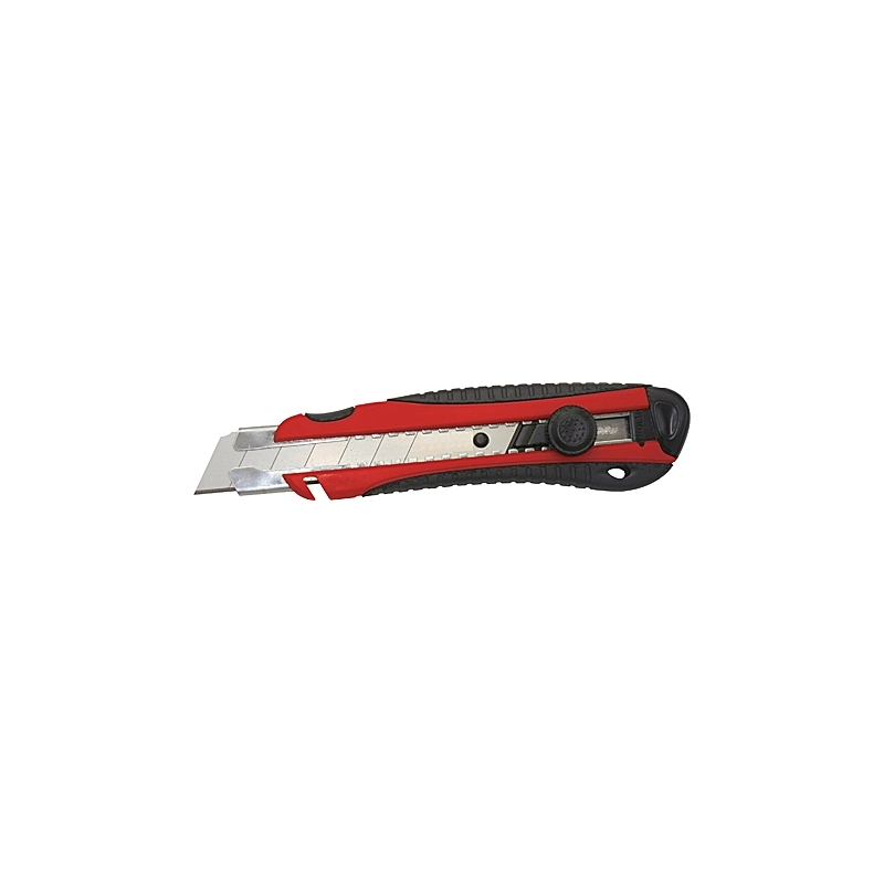 Corpo in ABS con inserto bicomponente ergonomico in gomma. Con pomello a vite. Scanalatura per il taglio dei cavi. Con serbatoio posteriore contenente 2 lame da mm 25