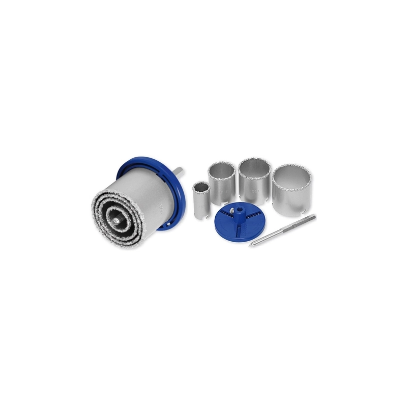 Sega a tazza con 4 lame con riporto in metallo duro e punta di centraggio. Per forare su muratura e ceramica. Per realizzare con precisione fori per impianti elettrici e sanitari. Profondita' di taglio 55 mm. Dimensioni seghe a tazza 33 - 53 - 63 - 73 mm. Max rpm 1500.