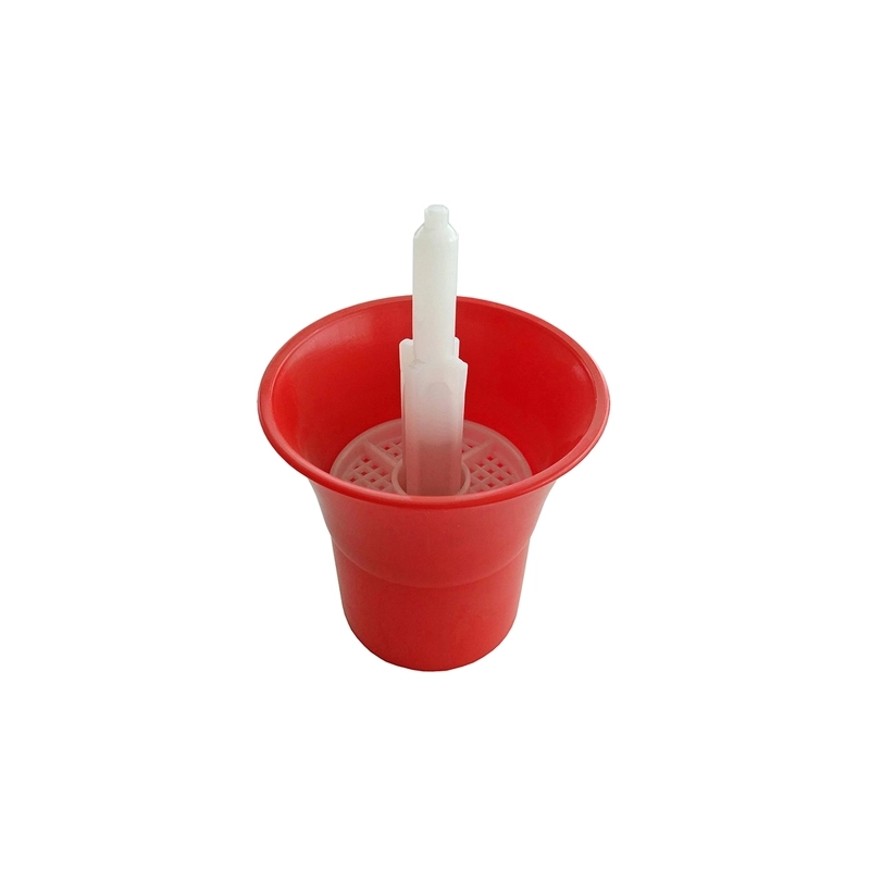 Svolge una doppia funzione di sciacquabottiglie in plastica con filtro e avvinatore. Colore rosso. Altezza 12 cm.
