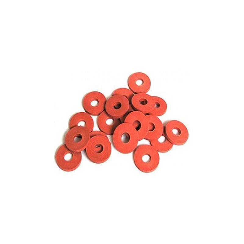 Guarnizione in gomma colore rosso. Diametro esterno 25 mm e diametro foro interno 7 mm. In confezione da 20 pezzi.