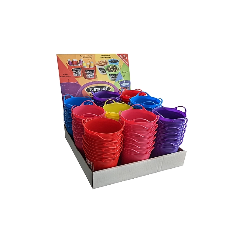 Espositore composto da 120 miniceste con maniglie, in plastica flessibile, leggera e resistentissima. Con certificato alimentare, atossico, resistente ai raggi UV ed al freddo. Adatte per svariati utilizzi (portaminuteria, portapenne, vasetti per piante, ecc..). Colori assortiti. Capacita' 0,37 lt. Diametro 9,5x7,2h cm.