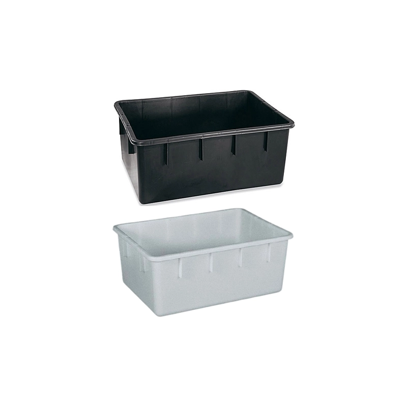 Cassa rettangolare in polietilene in colore bianco adatta per uso alimentare ed in colore nero fatta completamente con plastica riciclata per uso generico. Modello = capacita' lt/dimensioni cm/colore