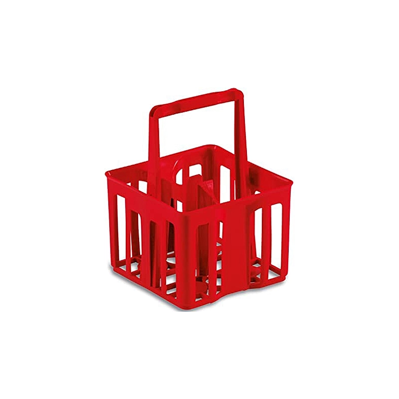 Cestello porta bottiglie/bottiglioni in polietilene ad alta densita'. Sede alloggio bottiglie 12x12 cm. Dimensioni cm 30x25x16h. Colore rosso.