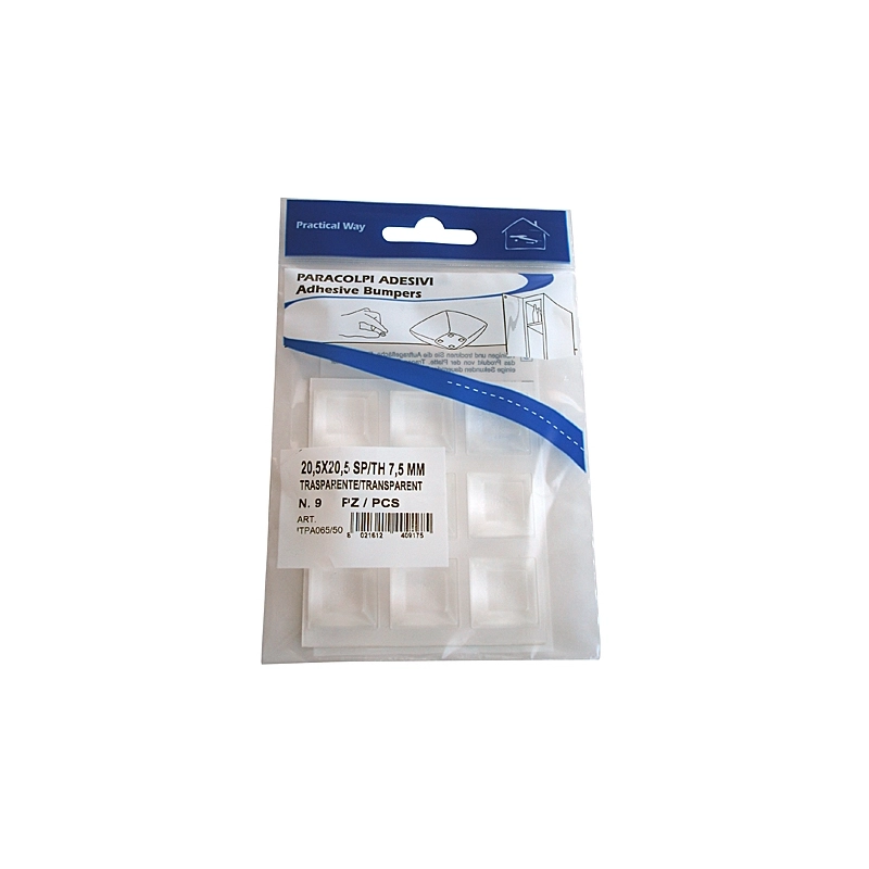 In poliuretano. Colore trasparente. Dimensioni 20,5x20,5 mm. Spessore 7,5 mm. Blister da 9 pezzi.