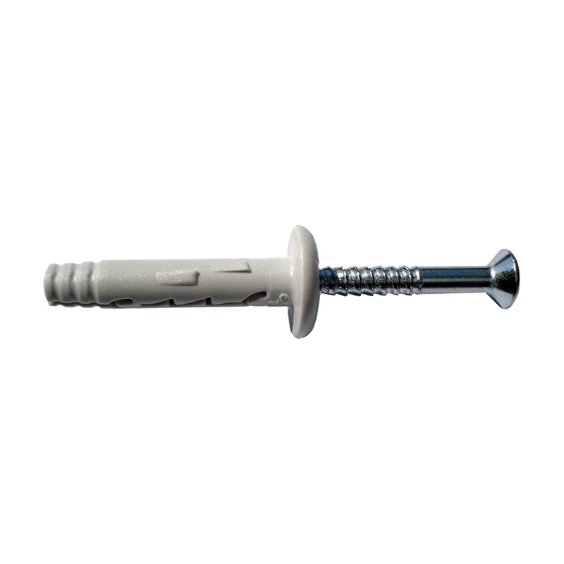 Con vite a chiodo d'acciaio. Tassello con collarino bombato. Indicato per il fissaggio passante di guide per cartongesso, lattonerie e canaline elettriche. Modello = dimensioni mm./spessore max fissabile mm