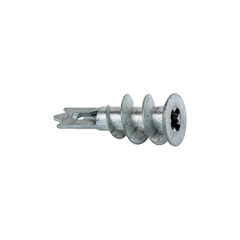 Tassello autofilettante in metallo per applicazioni su pannelli e lastre in cartongesso. Pre-forare con una punta da 8 mm quando si usa gesso-fibra o cartongesso doppio. Adatto per viti legno e autofilettanti con diametri da 4,0 a 5,0 mm. La testa a croce ne permette l'avvitamento con un cacciavite o un bits standard. Non e' richiesto nessun accessorio di avvitamento specifico. Lunghezza 31 mm.