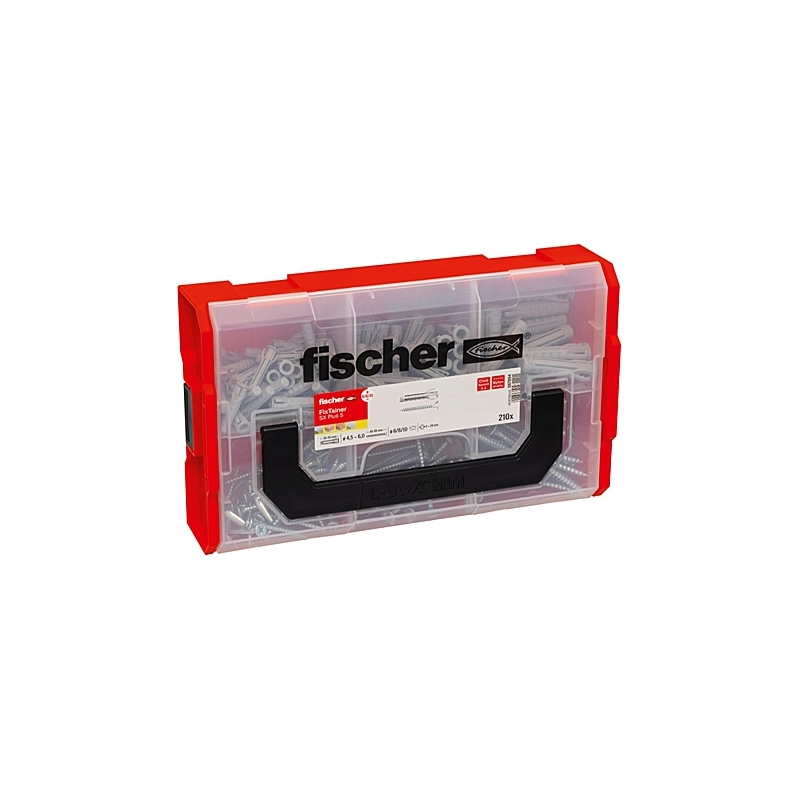 Utile contenitore con manico, suddiviso internamente in scomparti, riutilizzabile, impilabile. Contine 105 tasselli SX Plus assortiti diametro 6, 8 e 10 con viti.