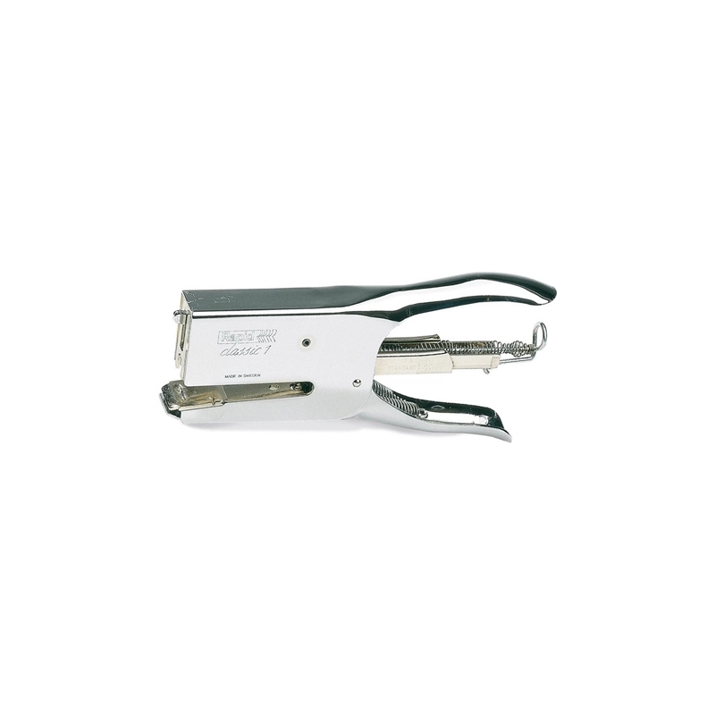 Cucitrice interamente metallica con finitura cromata. Per graffe tipo 24/6-8. Ribattitore reversibile per cucitura e spillatura.