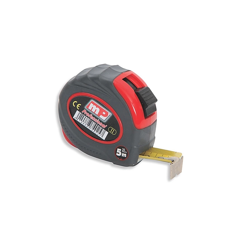 Flessometro Bi-componente con custodia in ABS e gomma. Fornito su cartoncino appendibile. Modello = Larghezza mm/Lunghezza m