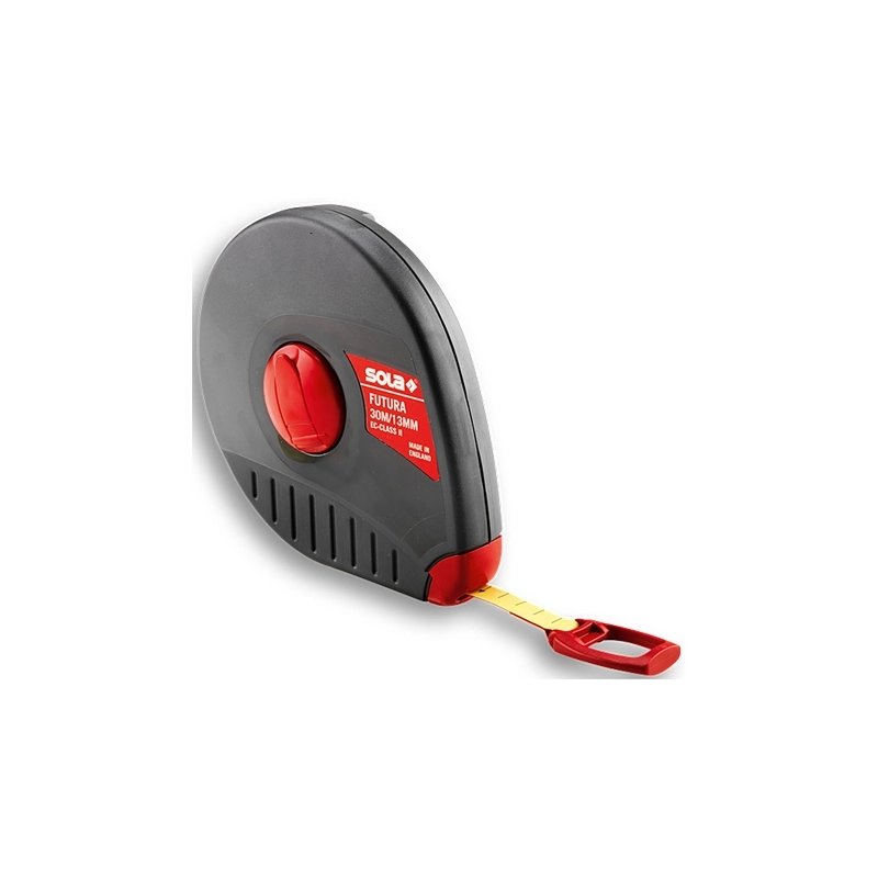 Corpo in resina antiurto con impugnatura integrata e manovella di riavvolgimento a scomparsa. Nastro in fibra di vetro, non conduttore, indeformabile con larghezza mm 13. Modello = lunghezza m