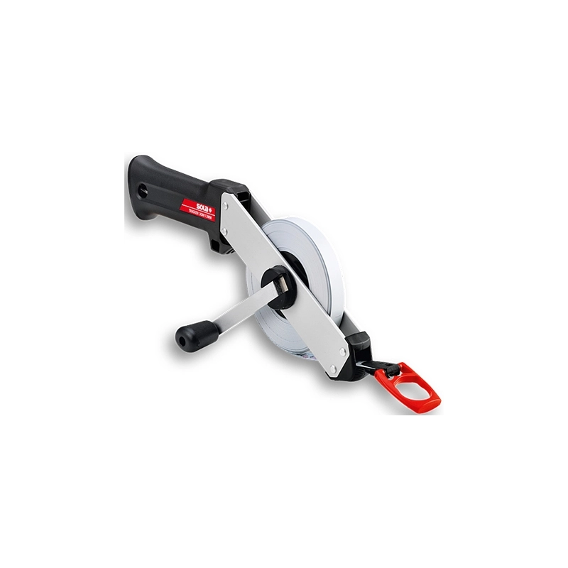 Con nastro in acciaio verniciato bianco. Larghezza mm 13. Lunghezza m 50. Corpo in alluminio dotato di comoda impugnatura