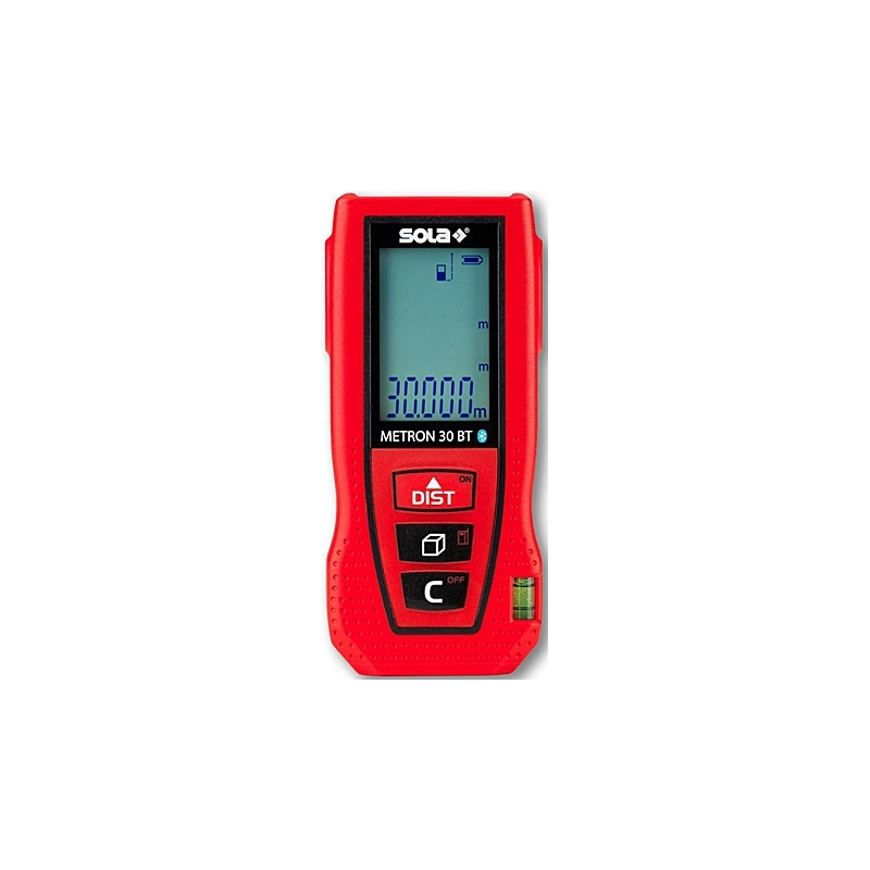 Misuratore laser compatto. Portata 30 mt. Precisione +/- 2 mm. Display illuminato con 3 righe valori. Funzioni: lunghezza misura continua, superficie, volume, min/max, misurazione indiretta di 2 punti. Dimensioni 105x47x27 mm. DIN EN 60825-1: 2007-03. IP54. Batterie 2x1,5 AAA incluse. Interfaccia Bluetooth per utilizzare l'app SOLA Measures.