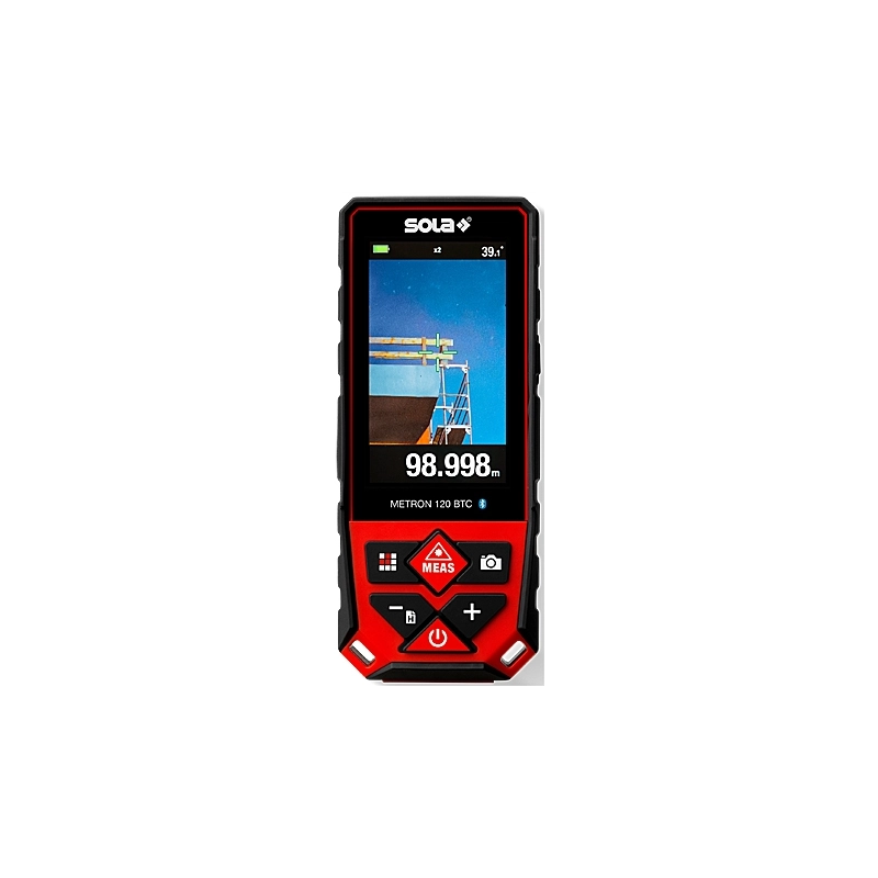Misuratore laser con mirino digitale. Portata 120 mt. Precisione +/- 1,5 mm. Display a colori illuminato con 4 righe. Funzioni: misura, misura continua, superficie, volume, misurazione indiretta a 2 o 3 punti o mediante angoli, sensore d'inclinazione, min/max, addizione e sottrazione. Dim.130x54x28 mm. IP65. Funziona con 3 batterie 1,2V Ni-Mh. Interfaccia Bluetooth con l'app SOLA Measures.